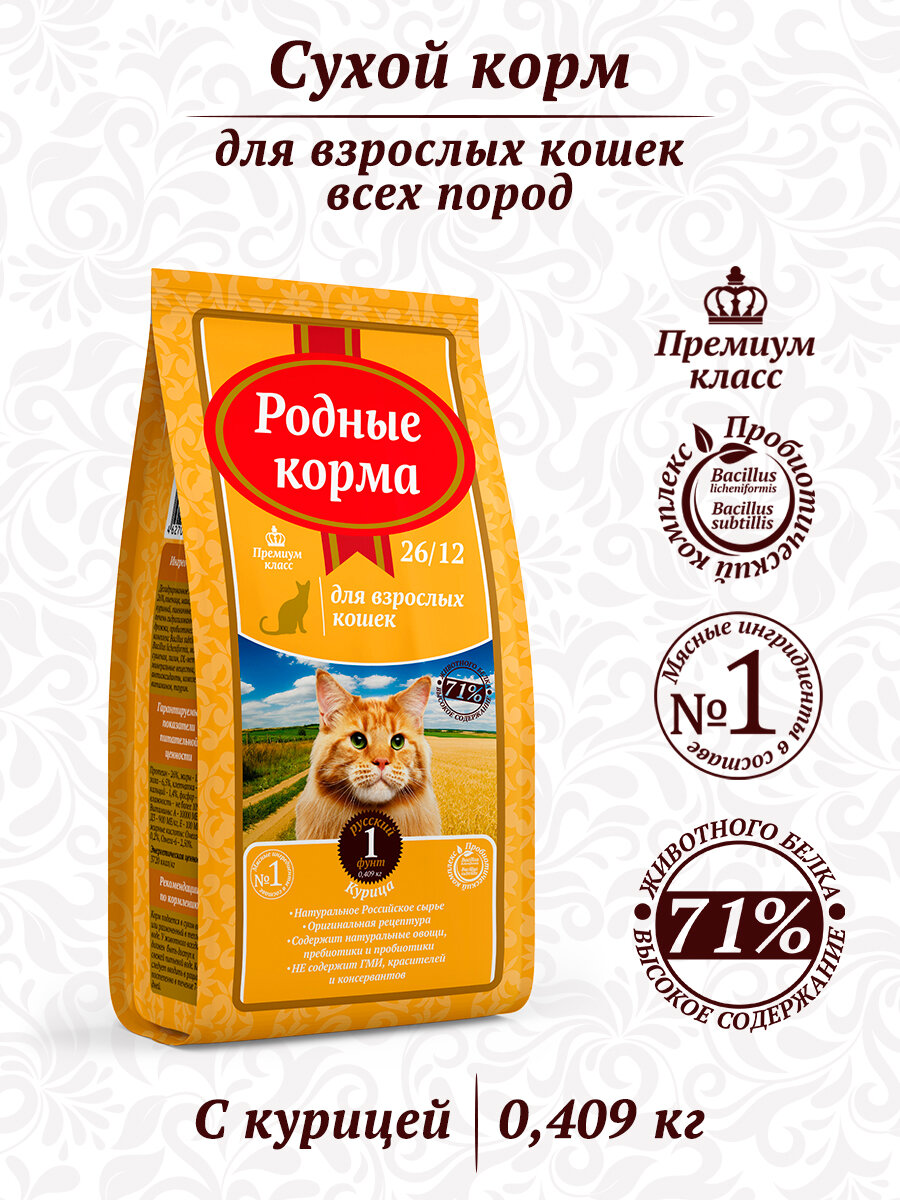 Родные корма 26/12 1 русский фунт 409 г сухой корм для взрослых кошек с курицей 1х24