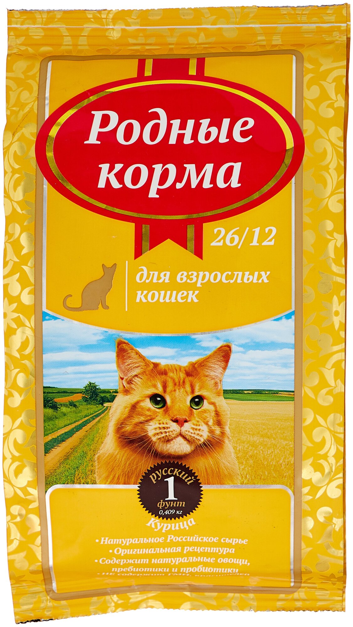 Сухой корм Родные Корма 26/12 1 русский фунт для взрослых кошек, с курицей 409 г .