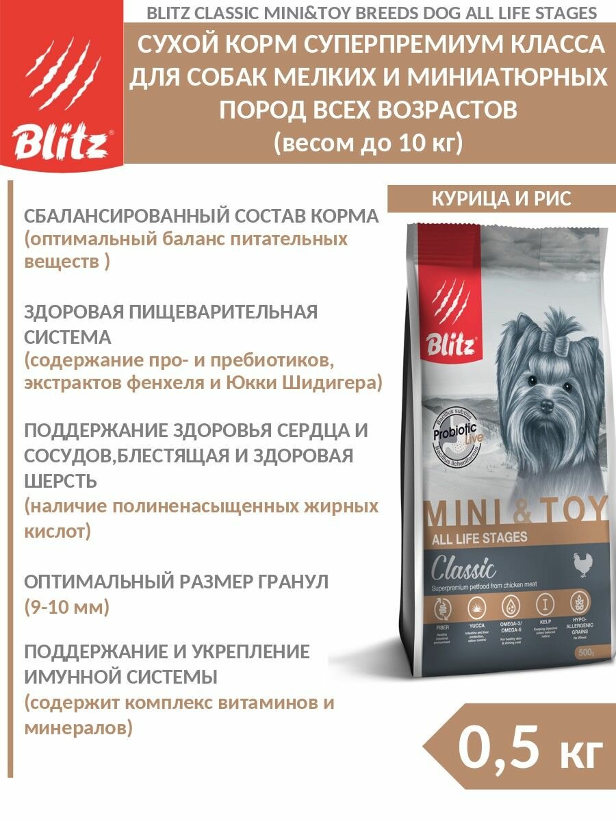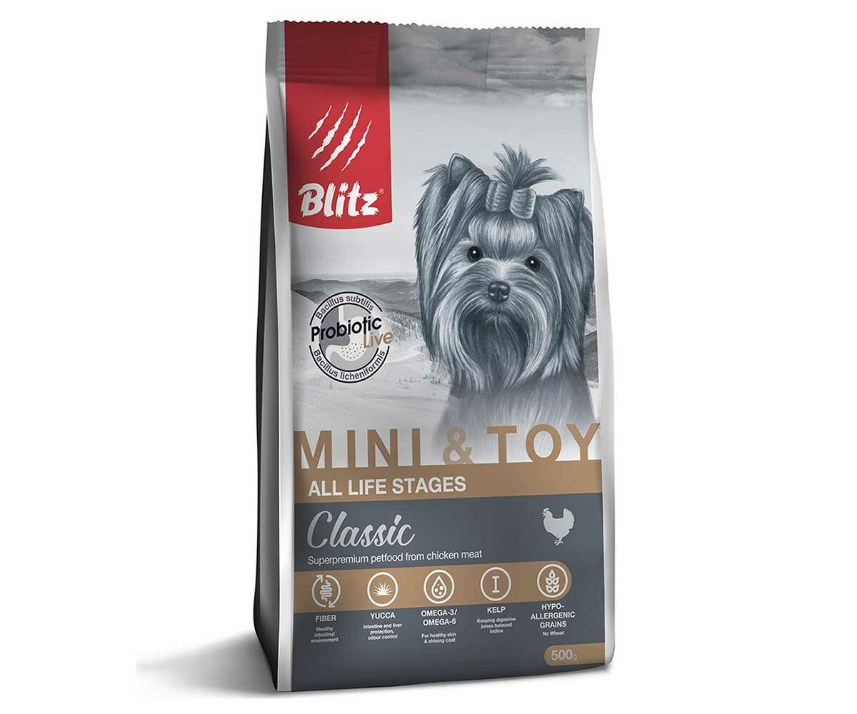 Корм сухой BLITZ Classic Mini & Toy Breeds Dog All Life Stages 0,5 кг для собак миниатюрных и мелких пород (курица)