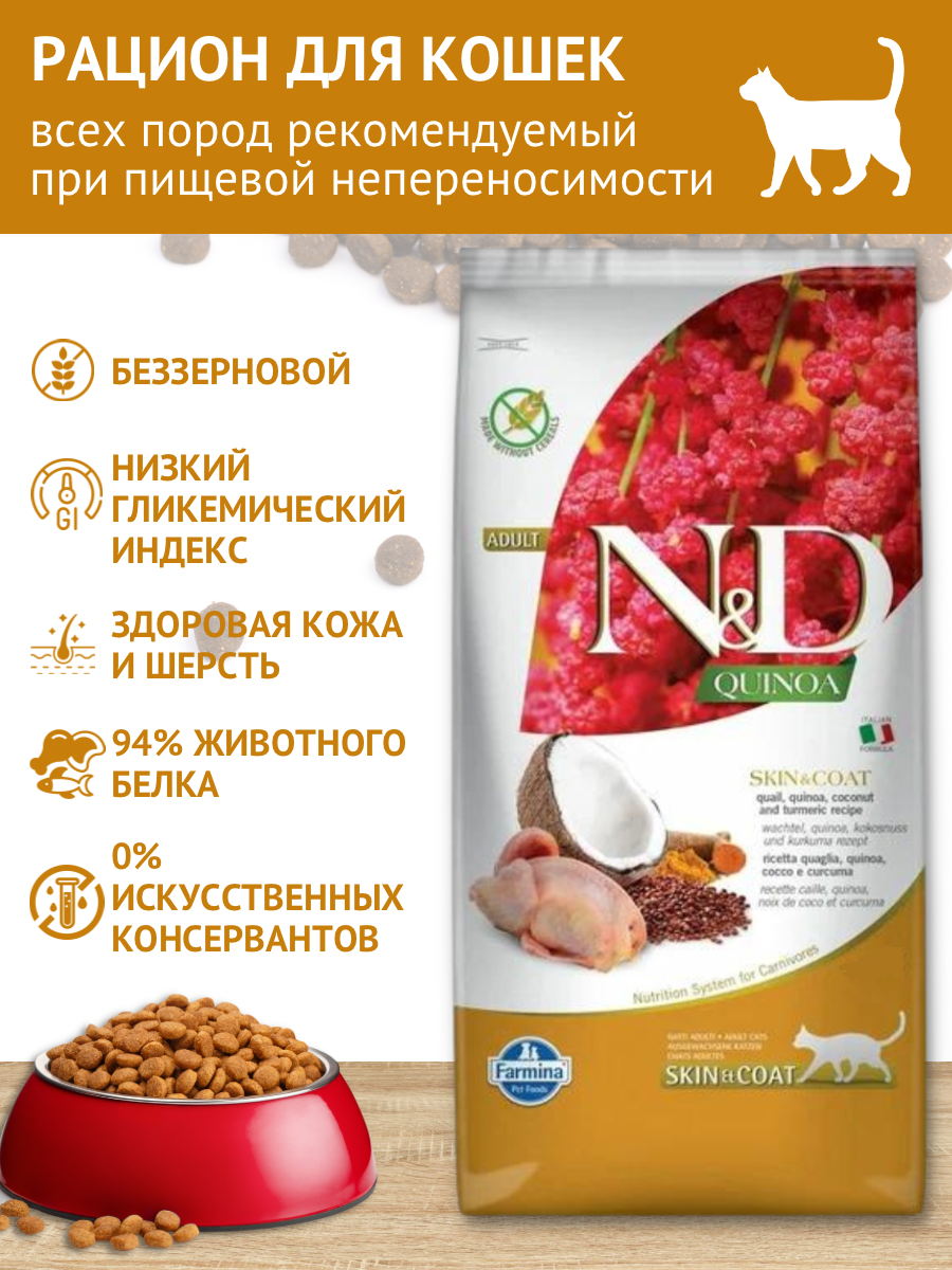 Фармина N&D QUINOA LINE для кошек QUINOA SKIN&COAT QUAIL Adult, 5 кг