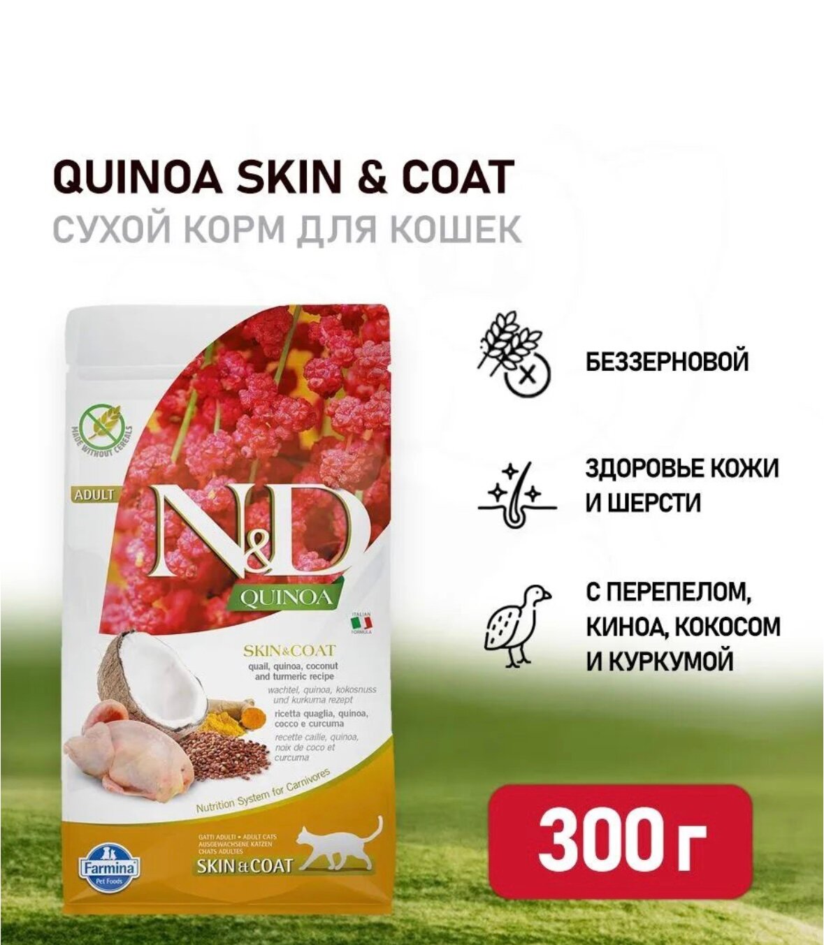FARMINA CAT N&D GRAIN FREE QUINOA SKIN & COAT QUAIL беззерновой для взрослых кошек при аллергии с перепелом и киноа (0,3 кг)