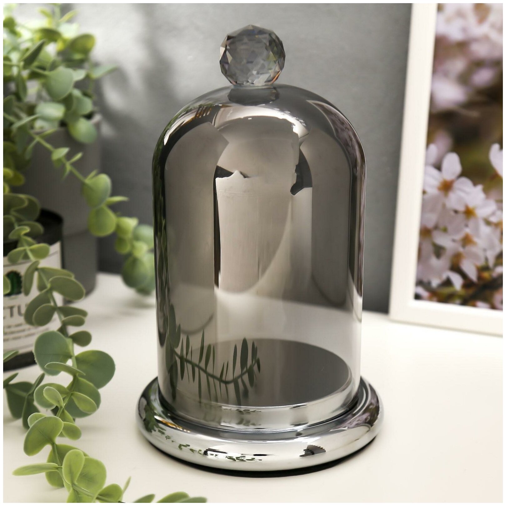 Подсвечник стекло на 1 свечу "Колба с кристаллом" серебристая дымка 20,6х12,5х12,5 см / праздничный декор/ интерьер/подарок на день рождения женщине/ праздничное освещение/сувенир интересное: