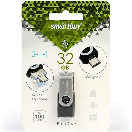 Флешка Smartbuy TRIO 3-in-1 OTG,32Гб, USB3.0, Type-C, microUSB, чт до 100Мб/с, зап до 10Мб/с