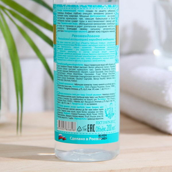 Тоник для лица живительное увлажнение кожи Рецепты бабушки Агафьи, 200 мл