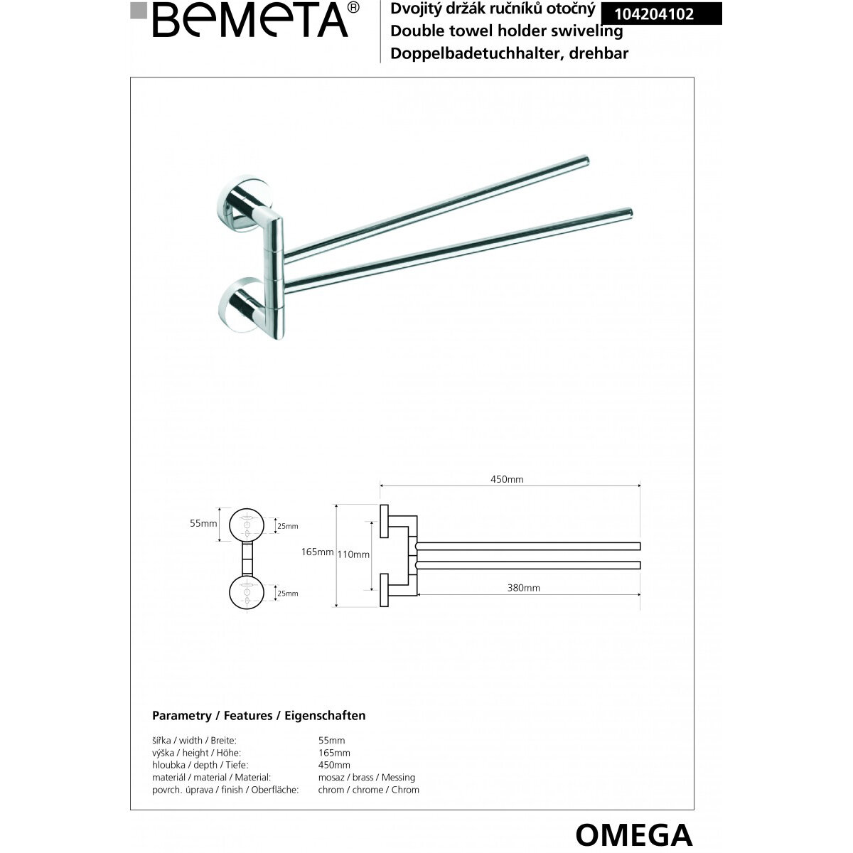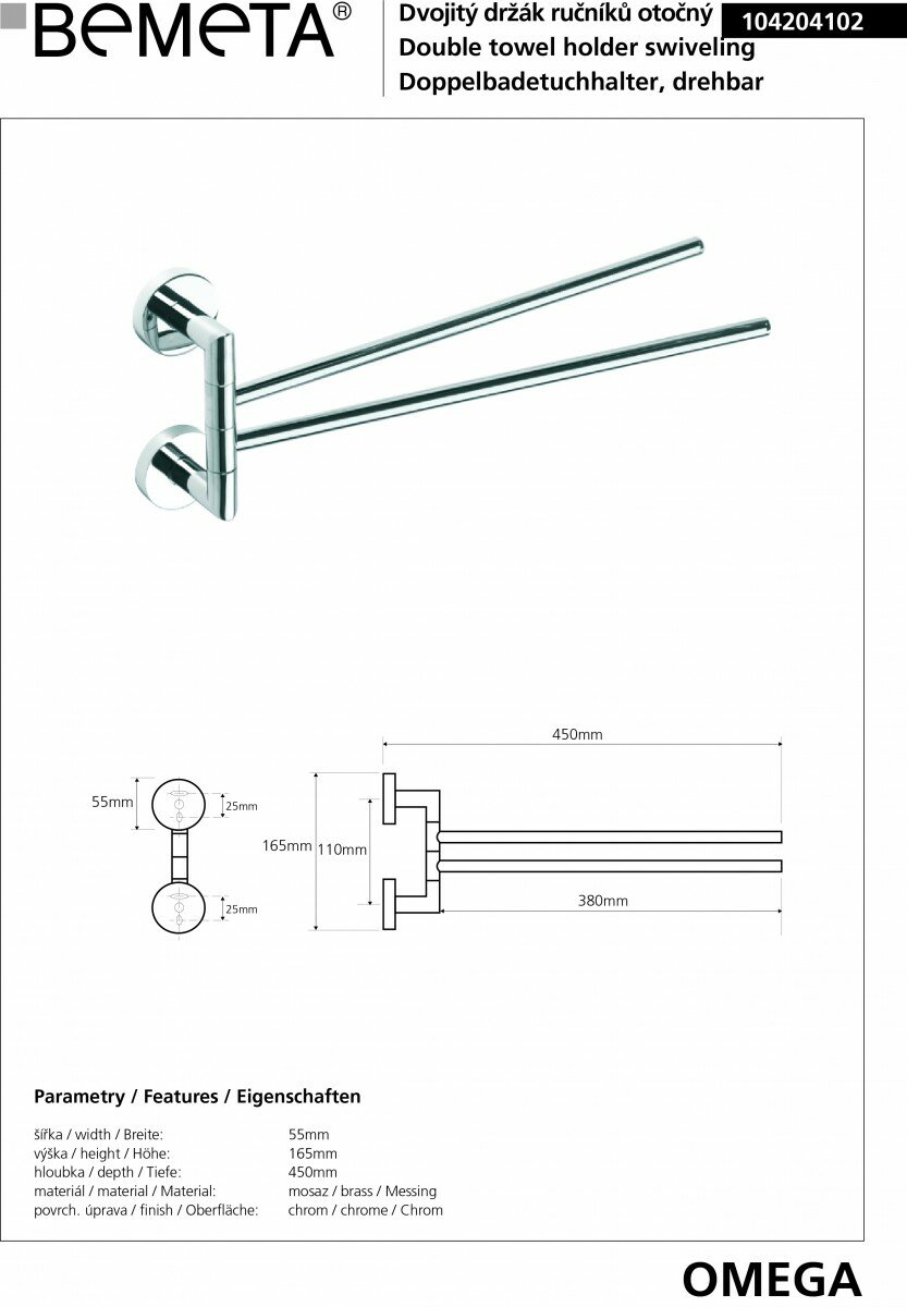Полотенцедержатель двойной Bemeta Omega 104204102 поворотный,хром