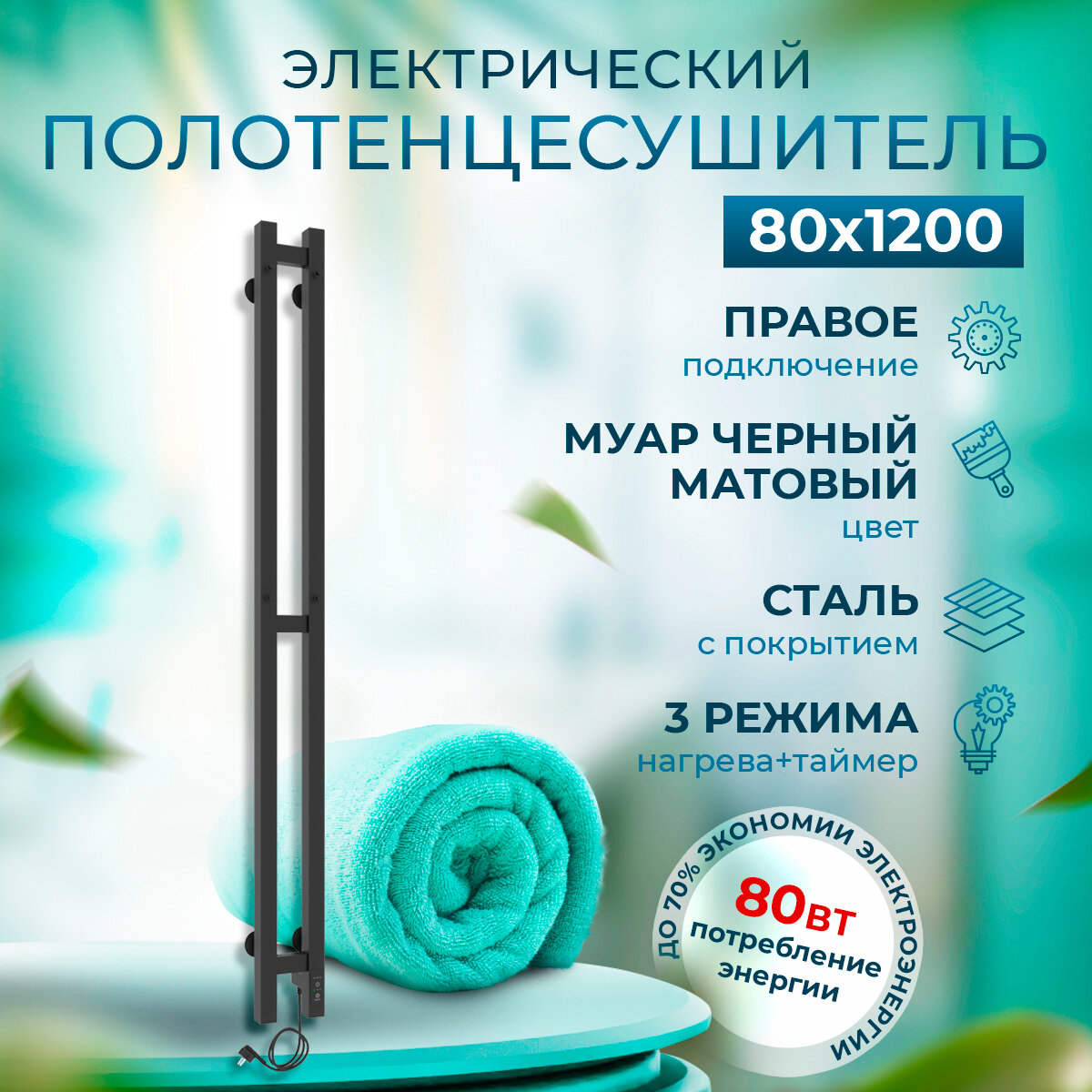 Полотенцесушитель электрический Laris Прайм Дуэт ЧКЧ 80/1200 Черный матовый правое подключение