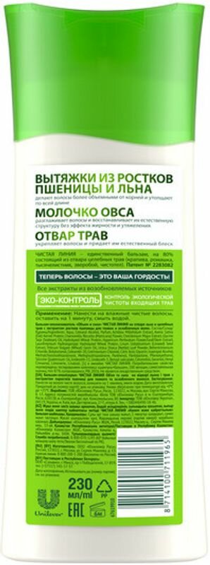Чистая линия Бальзам-ополаскиватель Объем для тонких и ослабленных волос Пшеница и Овес, 230мл