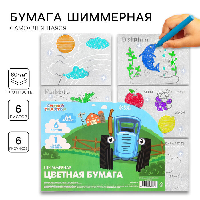 Бумага цветная самоклеящаяся, раскраска, А4, 6 листов, 1 цвет, с блёстками, односторонняя, в пакете, 80 г/м², Синий трактор интересное: