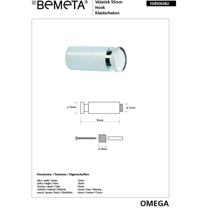 Крючок BEMETA Omega 16*55 мм