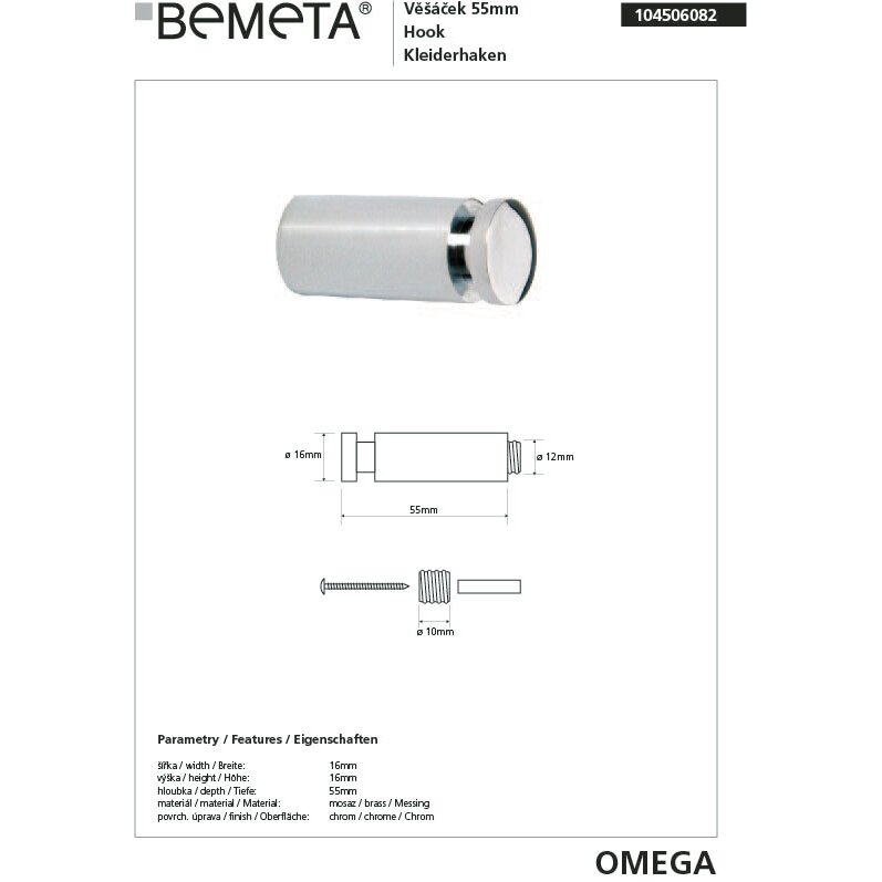 Крючок Bemeta 104506082 Omega Крючок 5.5 см, хром