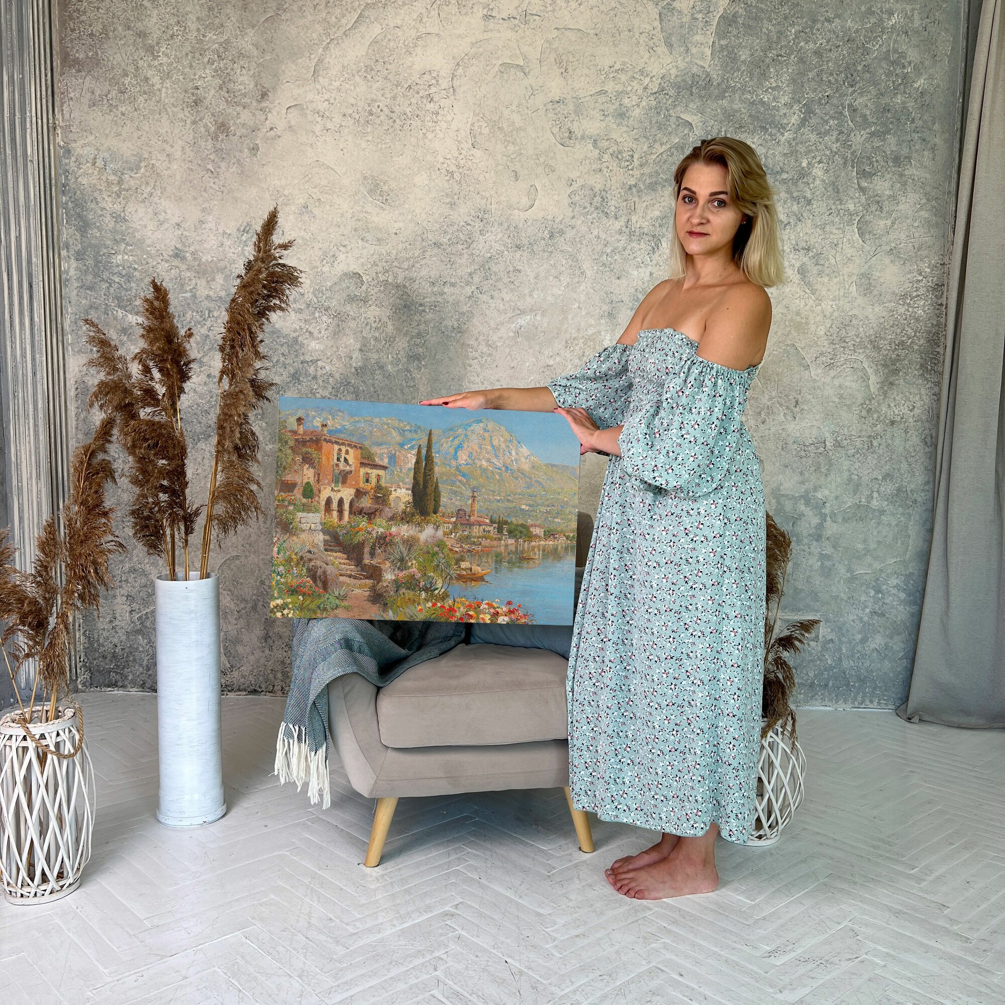 Картина на холсте "Картина деревня у воды" 50x70 см. Интерьерная, на стену. интересное: