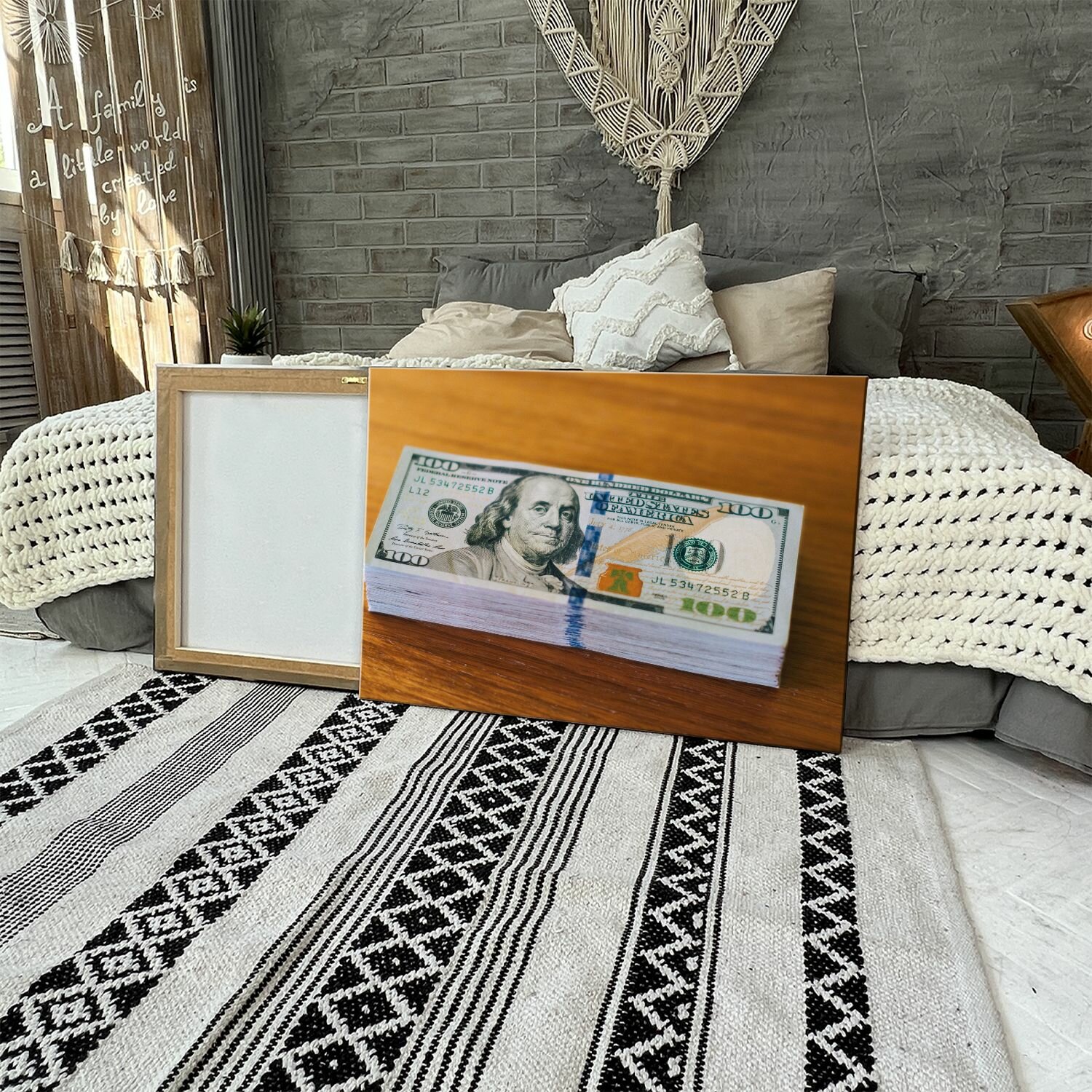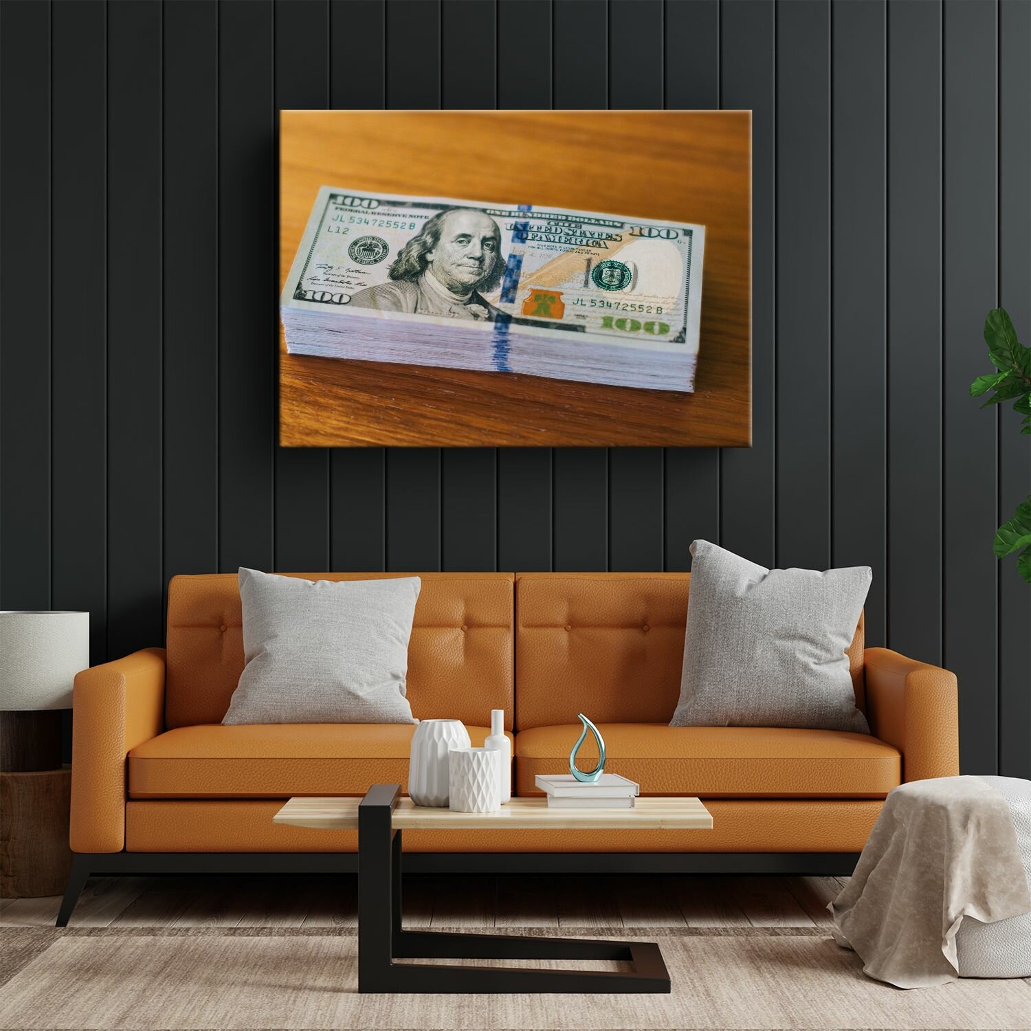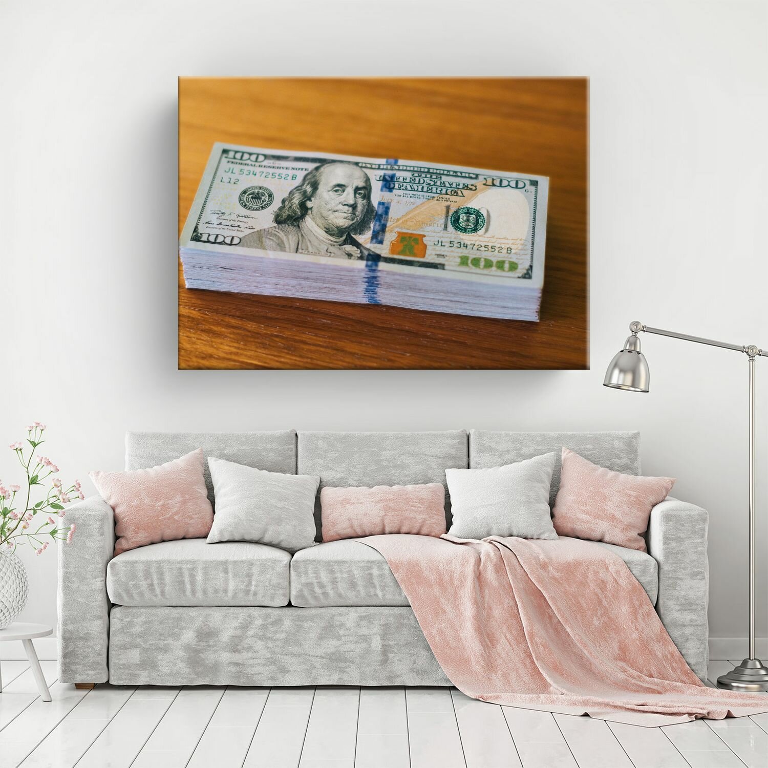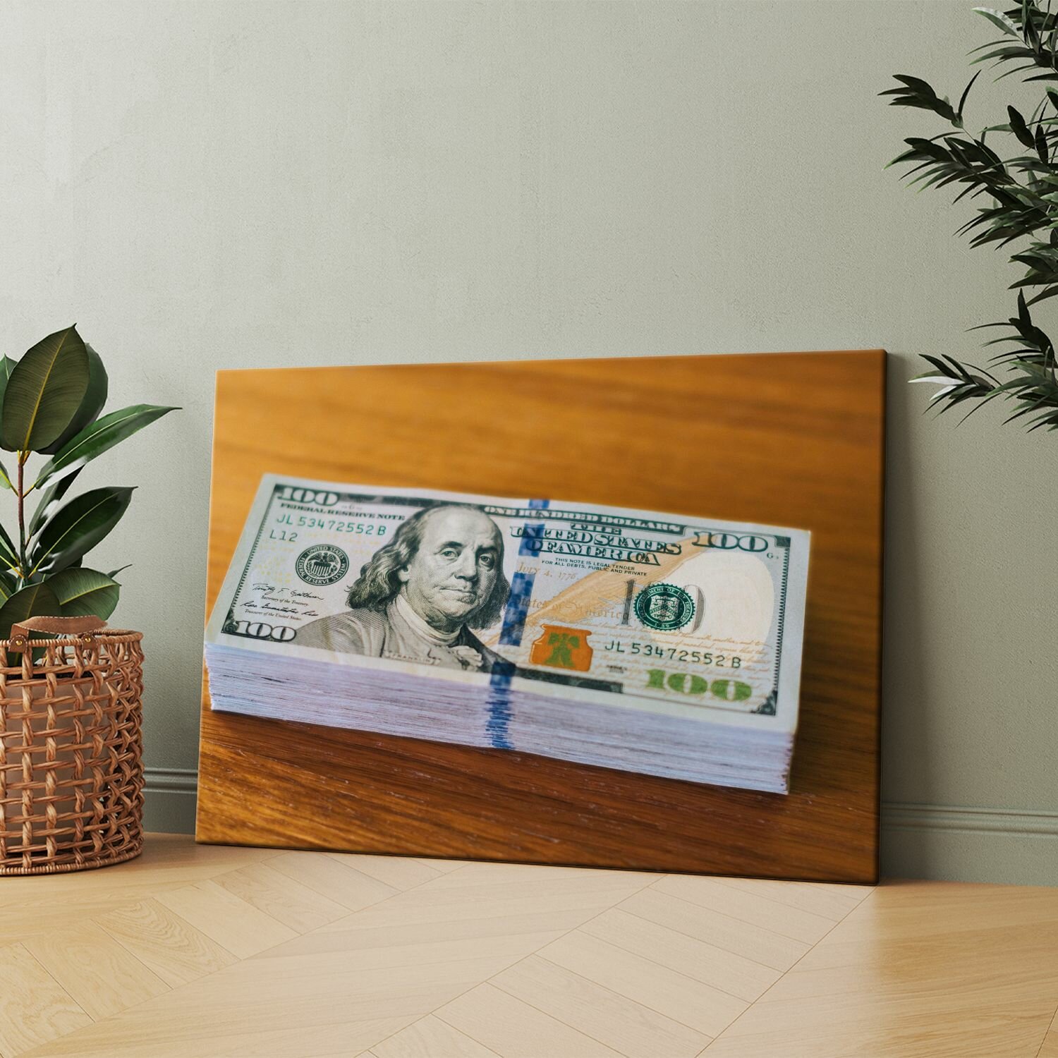Купить Картина на холсте (Пачка денег на деревянном столе) 20x30 см. Интерьерная, на стену.