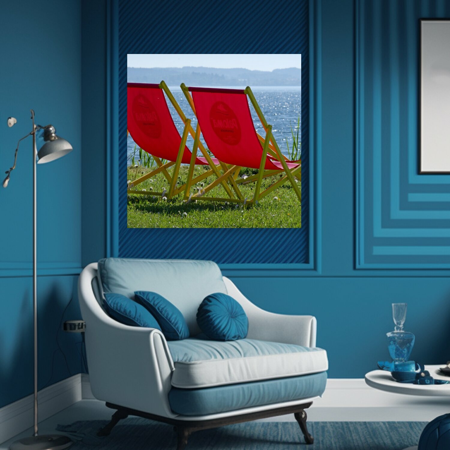 Купить Картина на холсте "Шезлонг, вода, озеро" на подрамнике 75х75 см. для интерьера