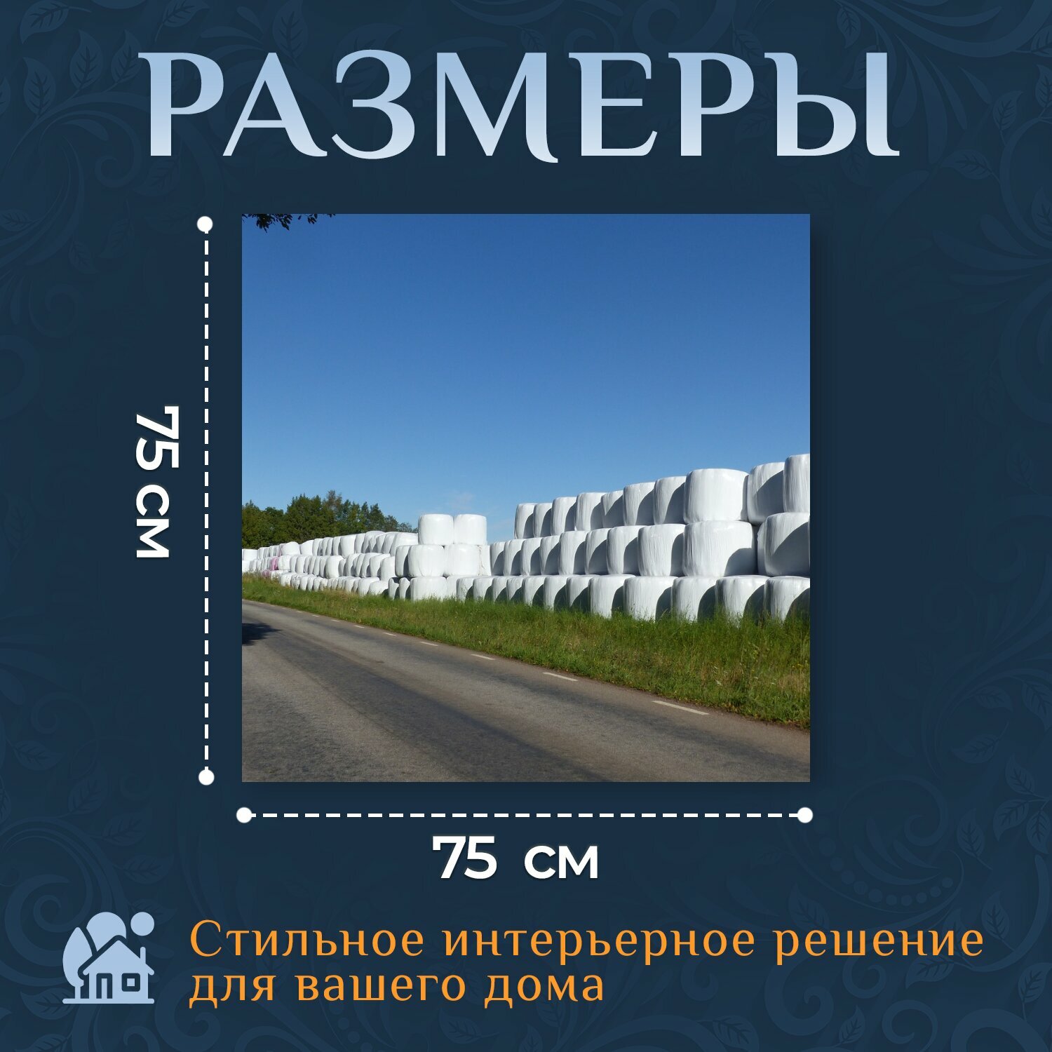 Картина на холсте "Тюки сена, пластик, белый" на подрамнике 75х75 см. для интерьера интересное: