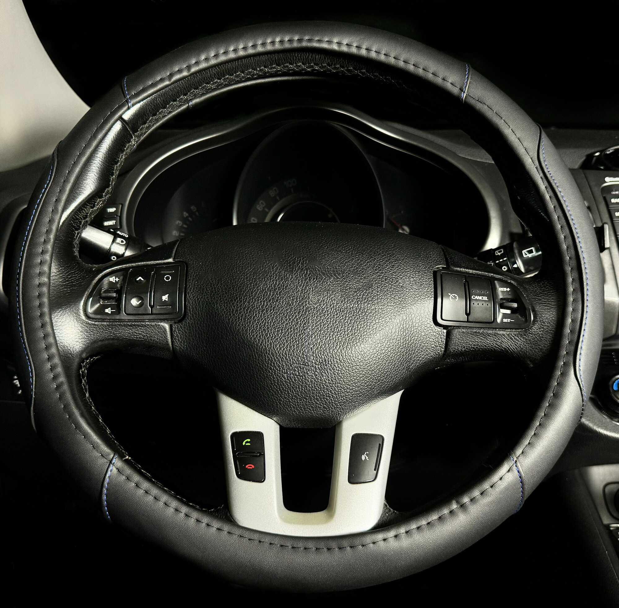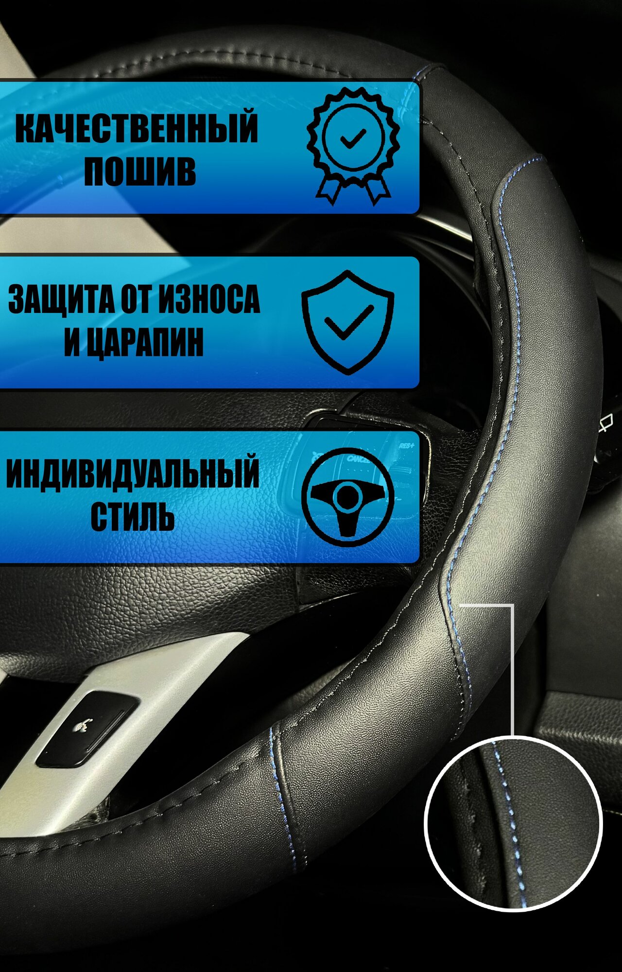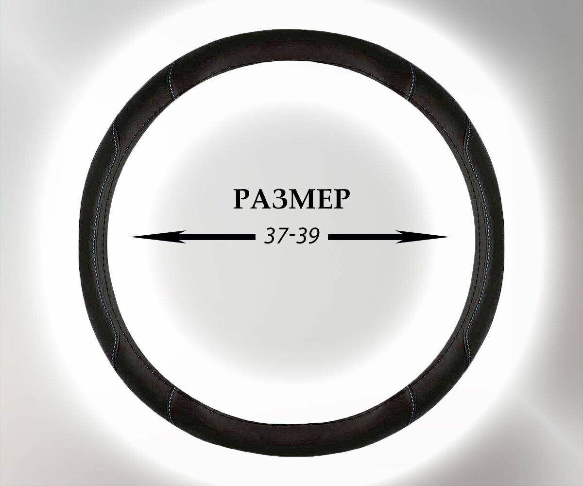 Оплетка, чехол (накидка) на руль Фольксваген Гольф Плюс (2009 - 2014) хэтчбек 5 дверей / Volkswagen Golf Plus, экокожа (премиального качества), Черный с синей строчкой интересное: