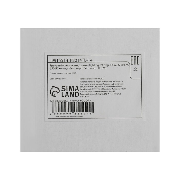 Luazon Lighting Трековый светильник, Luazon lighting, 24 deg, 40 W, 3200 Lm, 6500K, холодн. бел., корп. Бел. 99155 интересное: