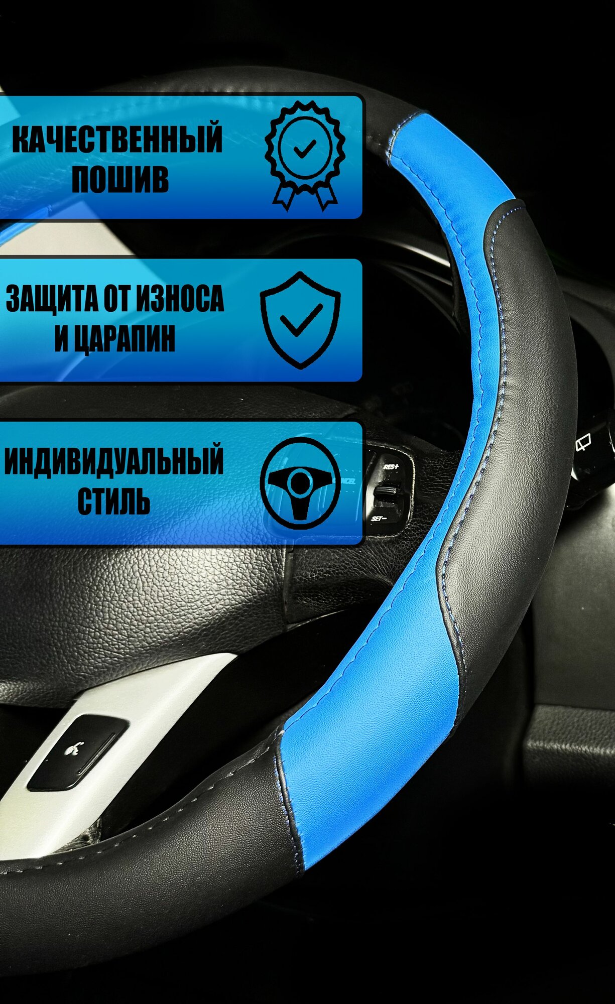 Оплетка, чехол (накидка) на руль Ауди ску5 (2020 - 2024) внедорожник 5 дверей / Audi SQ5, экокожа (премиального качества), Черный с синим интересное: