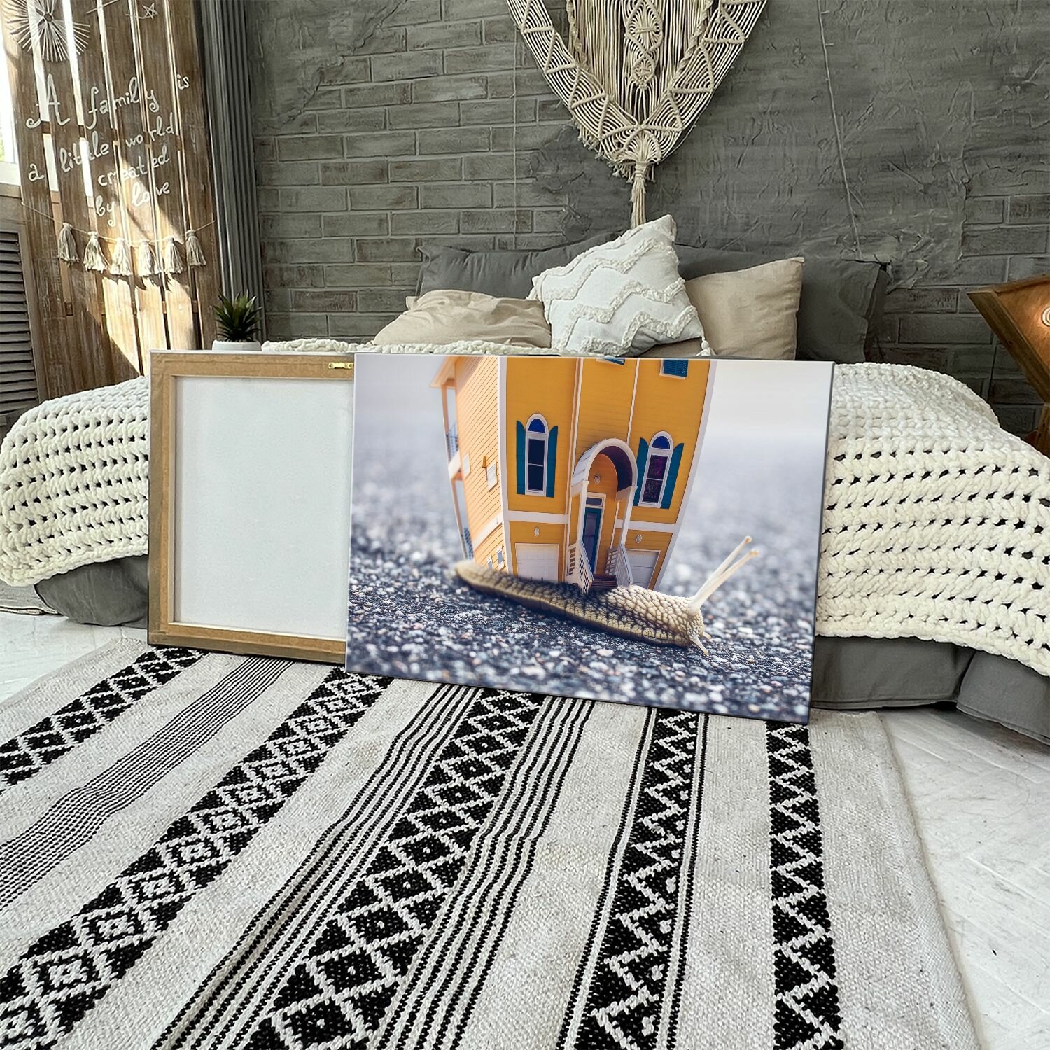 Купить Картина на холсте (Небольшой дом с ползущей по земле улиткой) 40x60 см. Интерьерная, на стену.