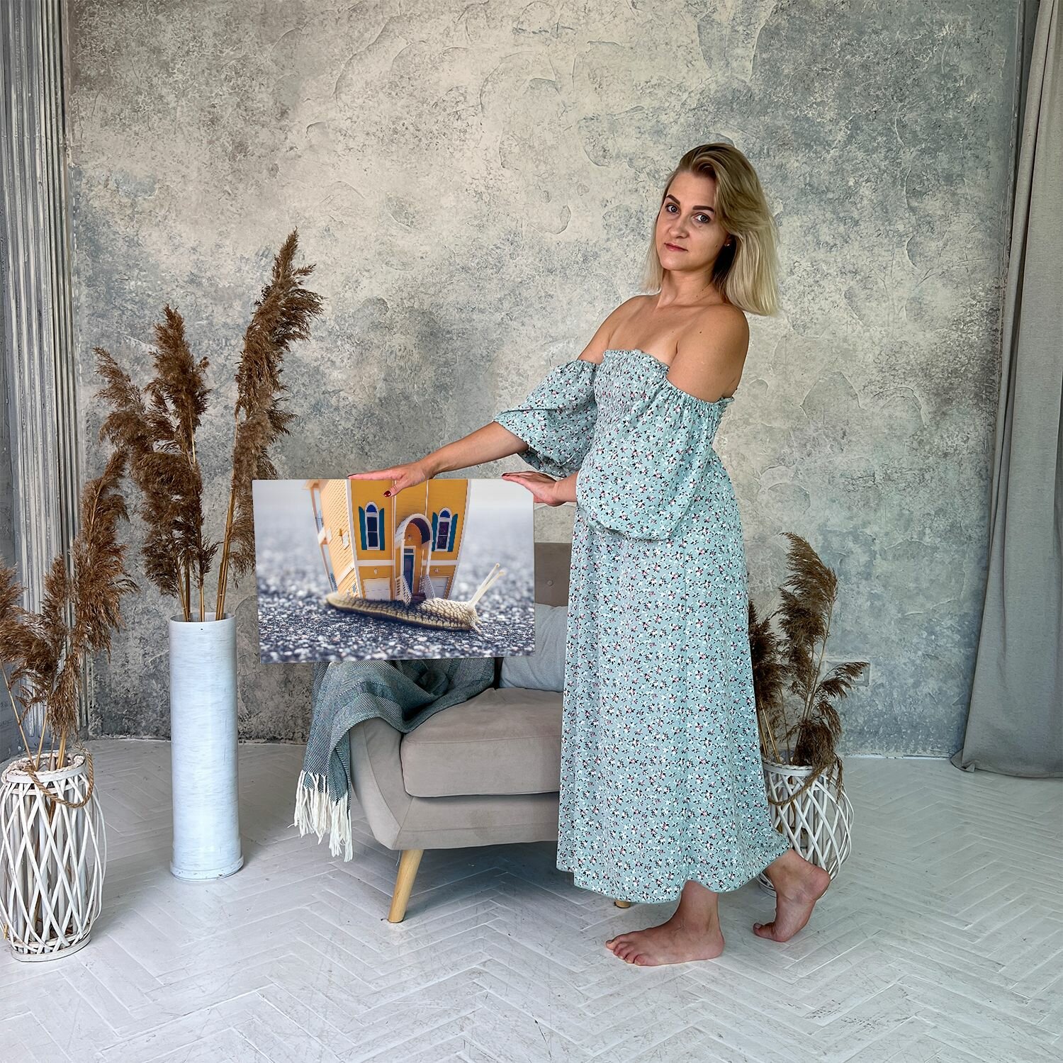 Картина на холсте (Небольшой дом с ползущей по земле улиткой) 40x60 см. Интерьерная, на стену. интересное: