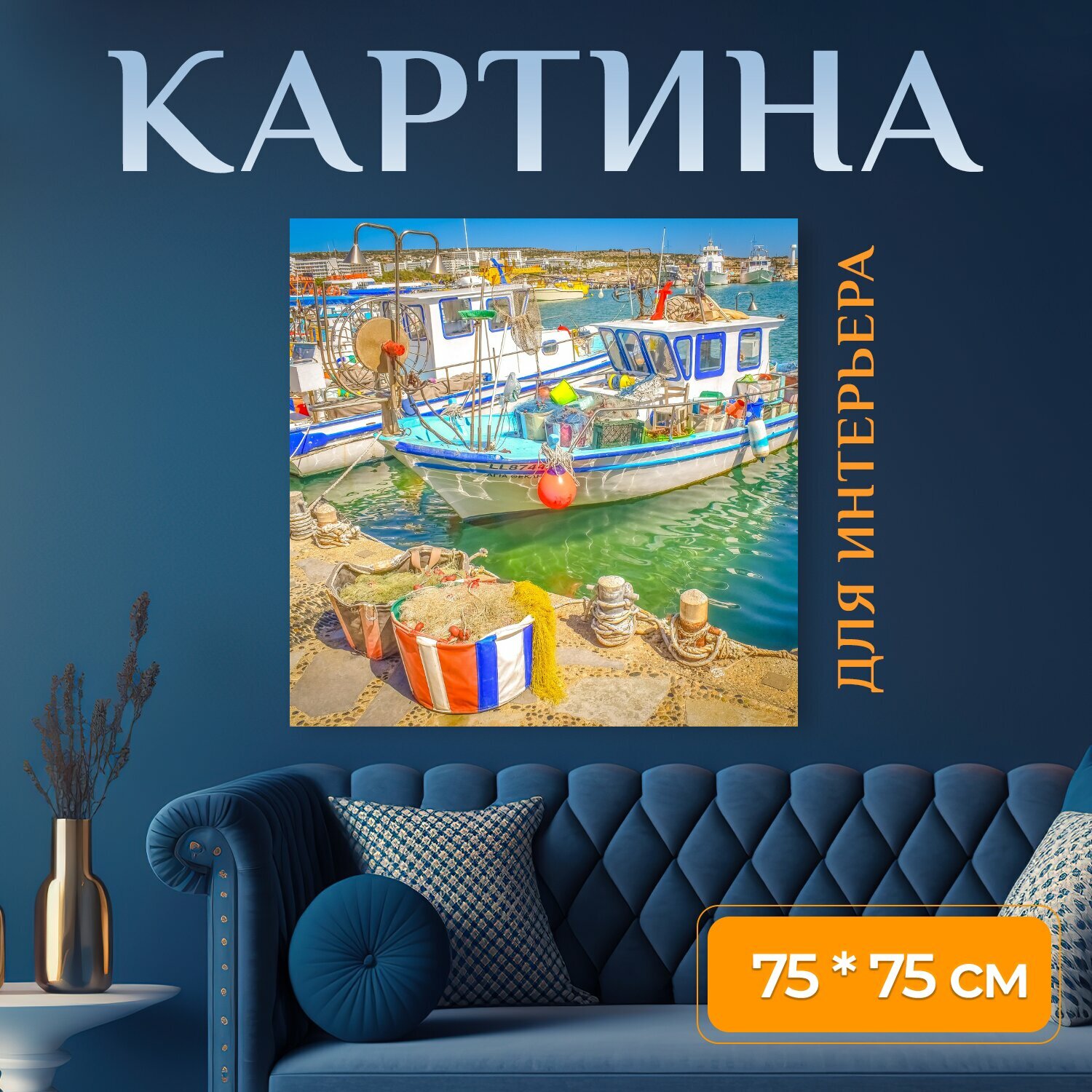 Картина на холсте "Лодка, рыболовная лодка, гавань" на подрамнике 75х75 см. для интерьера интересное: