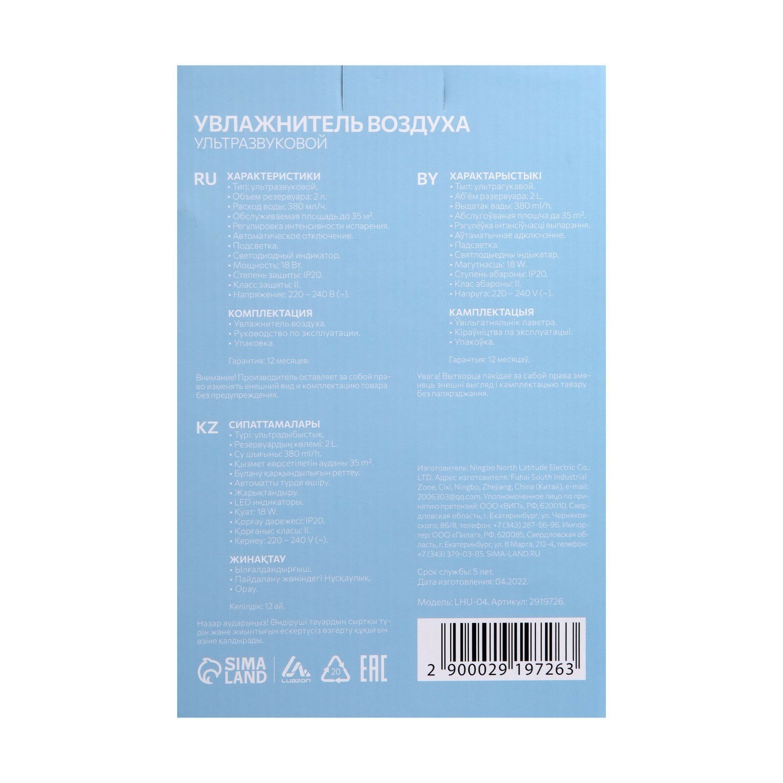 Luazon Home Увлажнитель воздуха Luazon LHU-04, ультразвуковой, 18 Вт, 2 л, 35 м2, бело-голубой