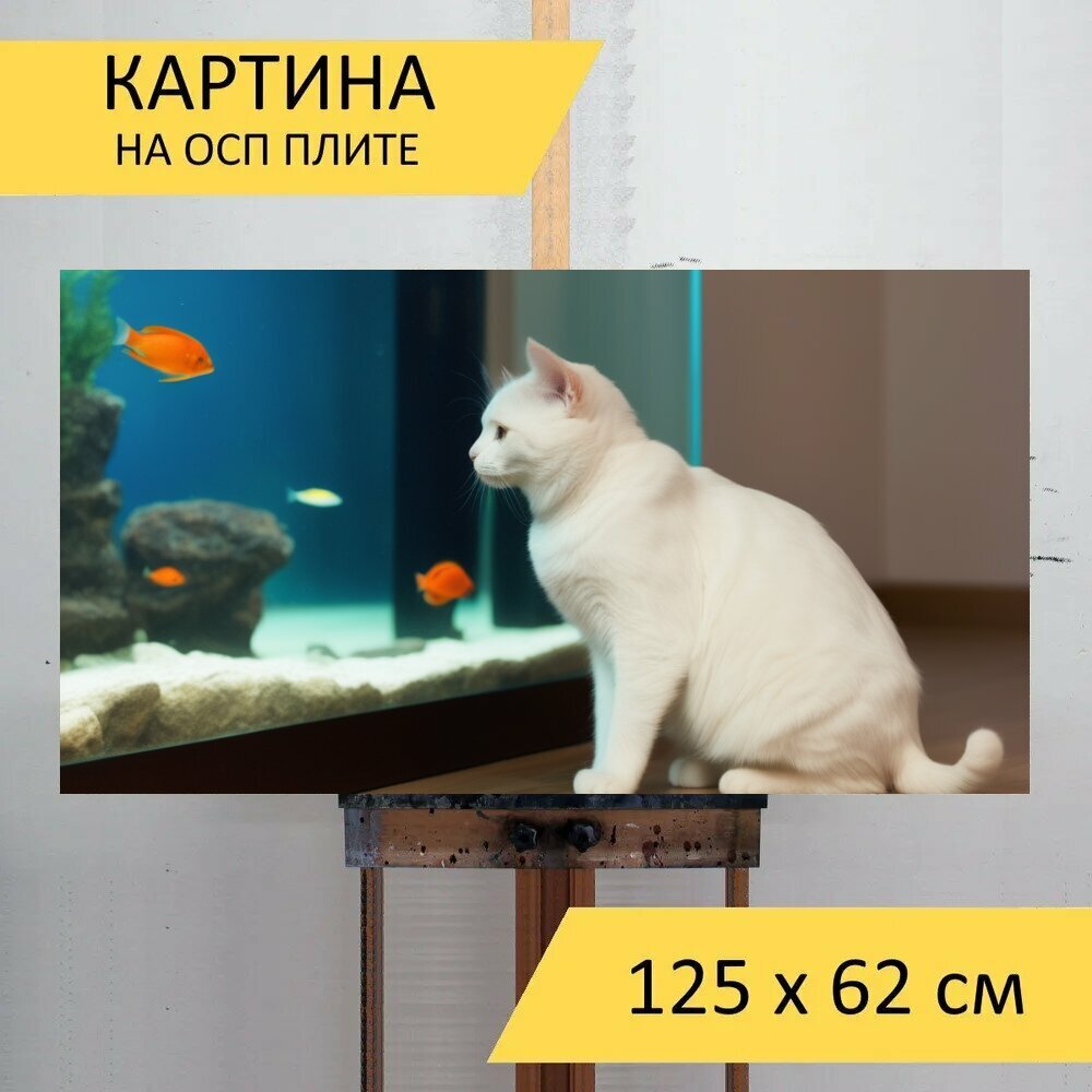 Вертикальная картина на ОСП для любителей животных "Домашние питомцы, коты, с рыбками" 125x62 см. для интерьера на стену интересное: