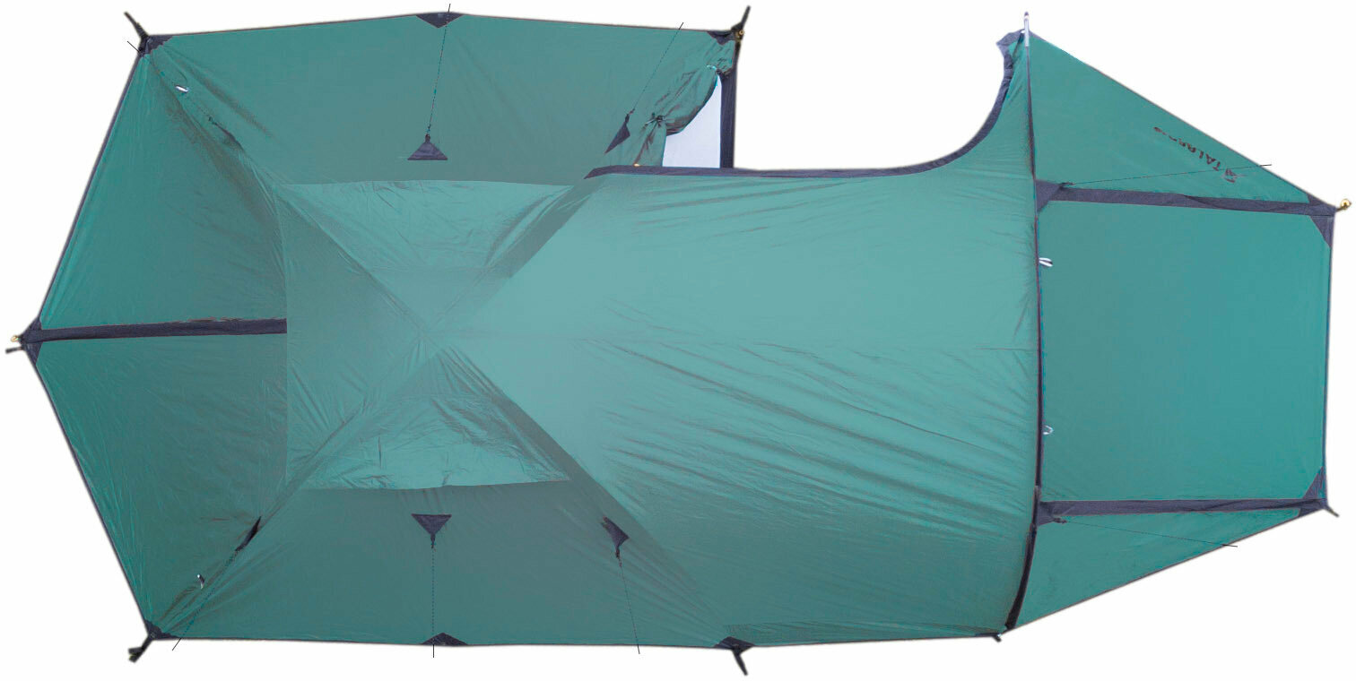 | Плюсы: | Качество отличное, устройство палатки практичное и удобное. При желании можно вместить и 6 человек, (учитывайте образование конденсата на внешней палатки), естественно дополнительно постелив тент в пристрое. |