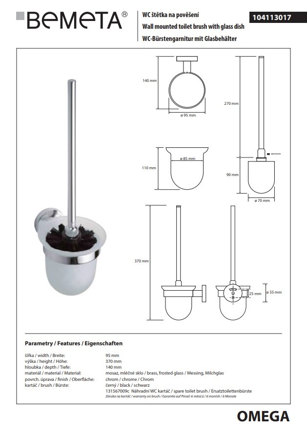 Настенный ёршик Bemeta Оmega, арт. 104113017, хром, стекло, черная щётка