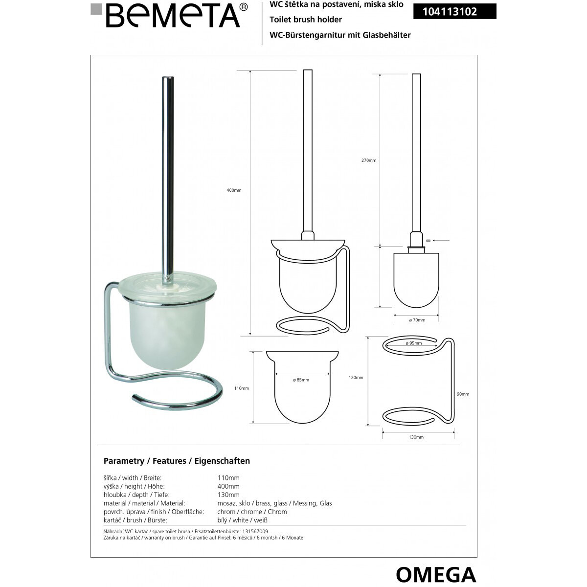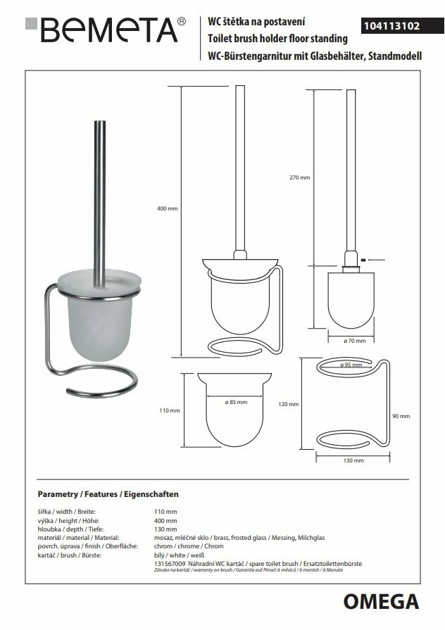 Ерш туалетный BEMETA Omega стеклянный с белой щеткой