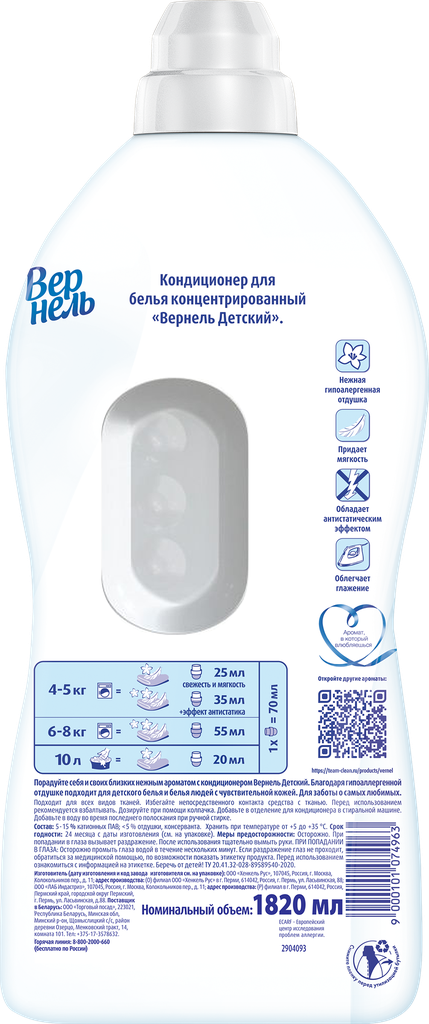 СохранитьКондиционер-ополаскиватель для белья 1,82 л вернель "Детский", концентрат, 2202906 упаковка 2 шт. интересное: