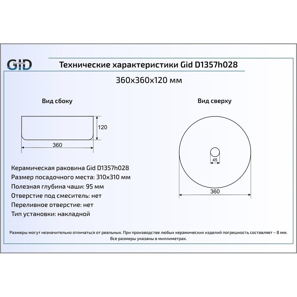 Накладная раковина 36x36х12 см, Gid, D1357h028