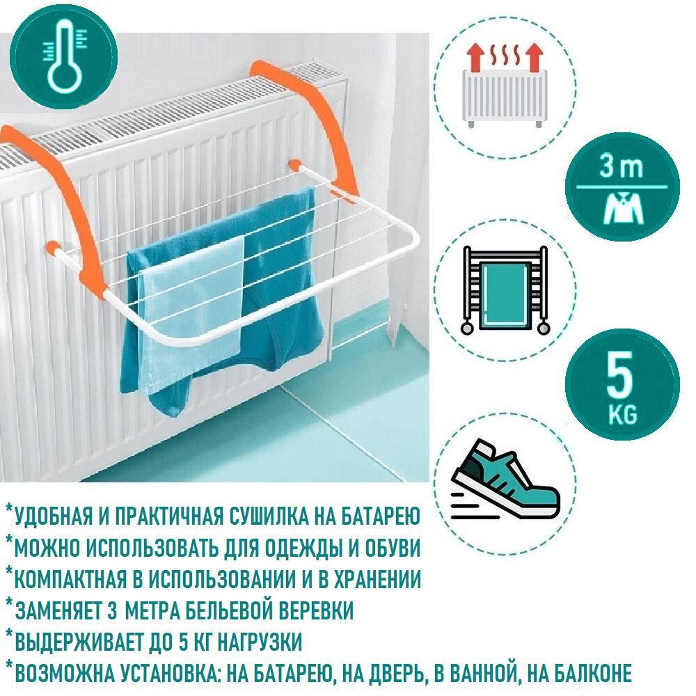 | Плюсы: | Удобна в эксплуатации, можно закрепить на батарее разной толщины . Подходит для сушки не очень тяжёлых вещей. За 218 руб - отличный вариант. |