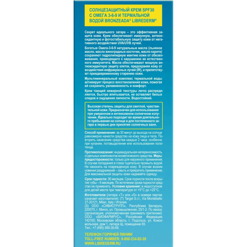 LIBREDERM BRONZEADA Солнцезащитный крем SPF30 с Омега 3-6-9 и термальной водой 150 мл, Беларусь
