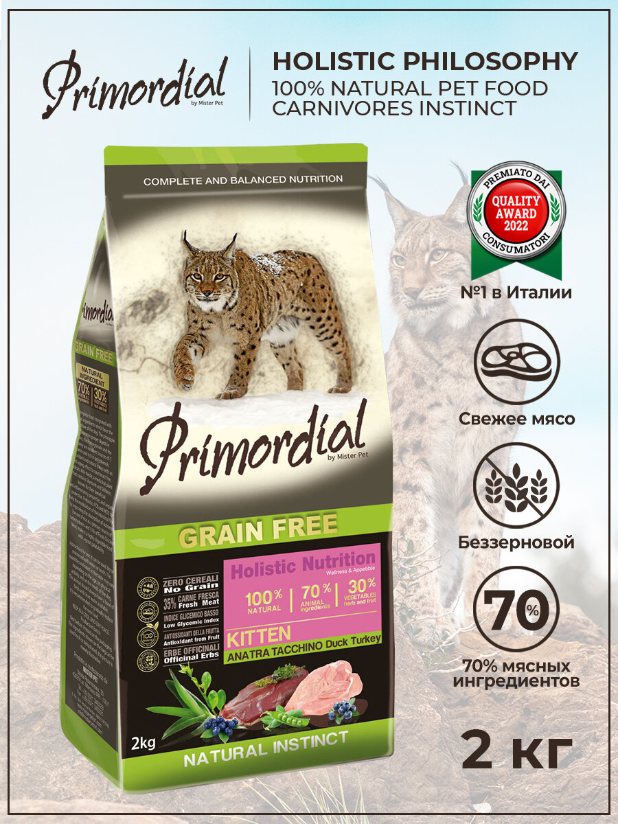 Сухой корм для котят Primordial беззерновой, с уткой, с индейкой 2 кг