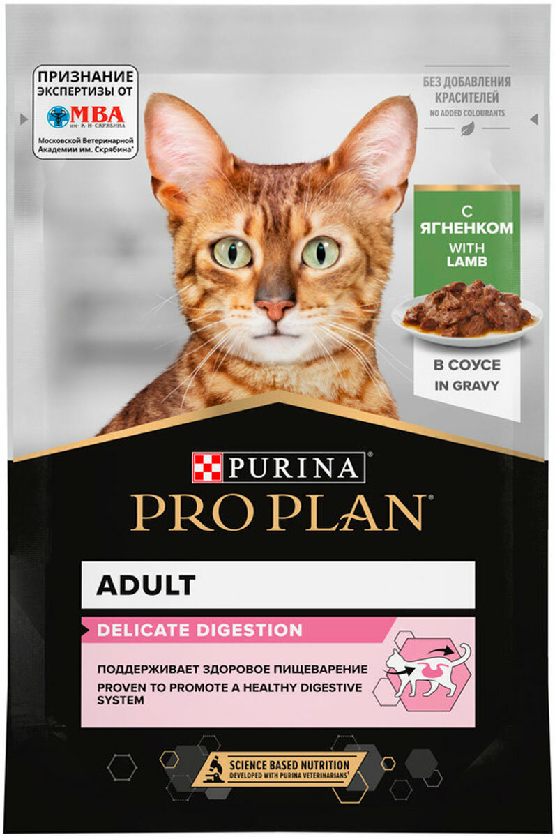 Влажный корм Pro Plan DELICATE для взрослых кошек с чувствительным пищеварением или особыми предпочтениями в еде, с ягненком в соусе, паучи, 85г.*12шт.