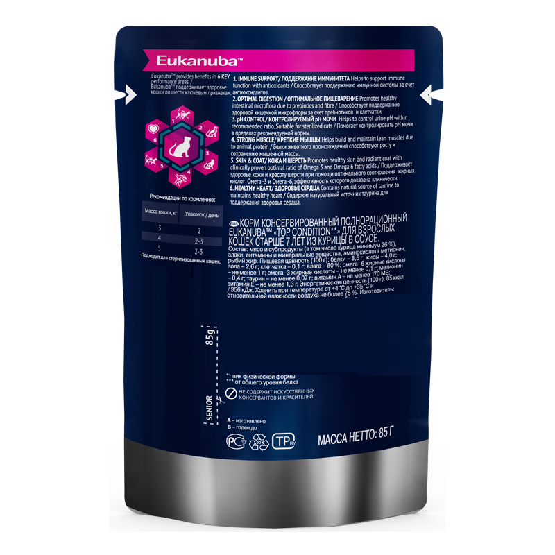 СохранитьEukanuba SENIOR TOP CONDITION CHICKEN пауч влажный корм для кошек старше 7 лет, курица в соусе, 85 гр интересное: