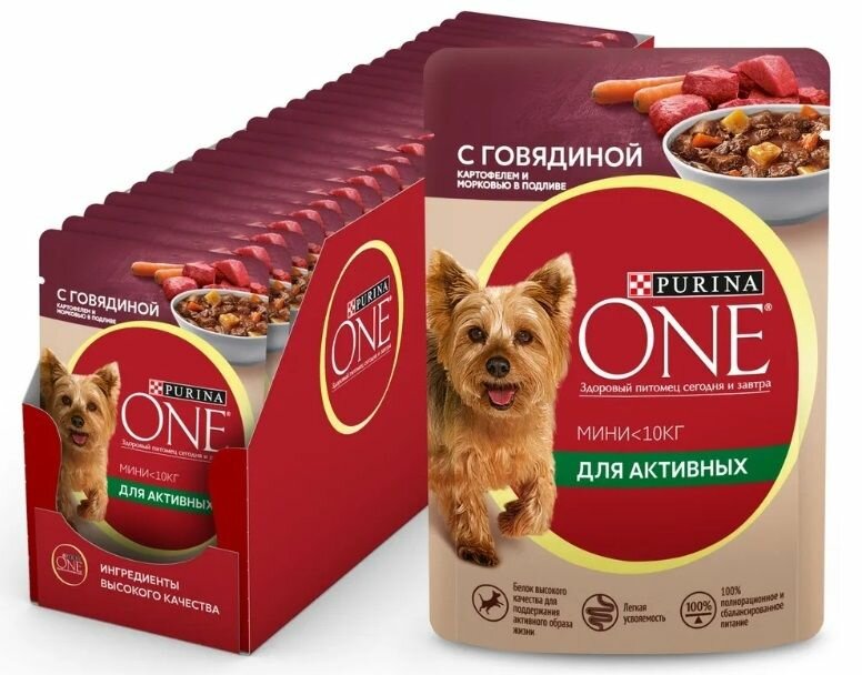 Влажный корм Purina ONE мини для активных, для собак мелких пород, с говядиной, картофелем и морковью в подливе, пауч, 26х85 г