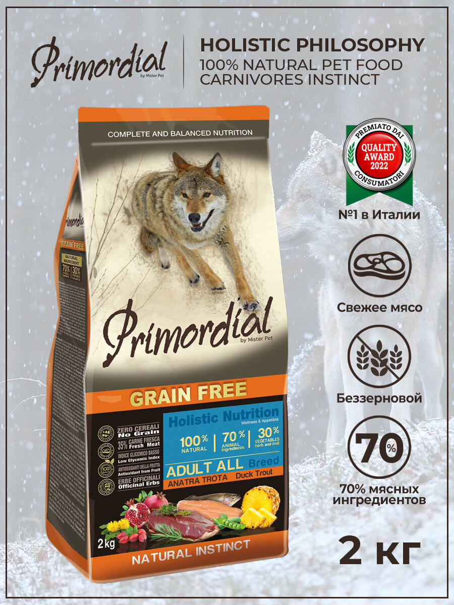 PRIMORDIAL ADULT ALL BREED беззерновой для взрослых собак всех пород с форелью и уткой (2 кг)