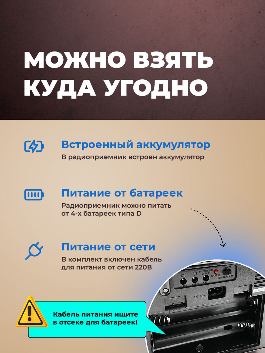 - Отличное качество приема радио даже с убранной антенной. - Отличное качество звука (только если не делать громкость на максимум). - Наличие USB, MicroSD и Bluetooth. (сопряжение легкое и быстрое). - Возможность питания от сети/ встроенного аккумулятора/ батареек. |