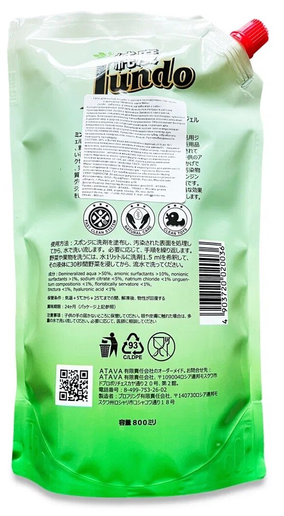 Jundo Концентрированный ЭКО гель с гиалуроновой кислотой для мытья посуды и детских принадлежностей «Green tea with mint»,800мл