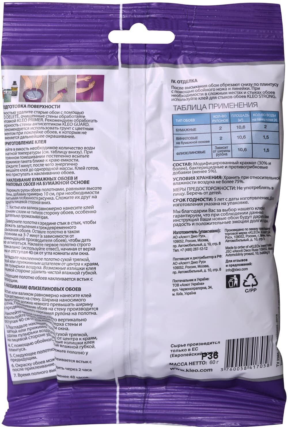 Купить Универсальный обойный клей KLEO MINI 12 для наклеивания всех видов флизелиновых, виниловых и бумажных обоев. Для внутренних работ. 60г.