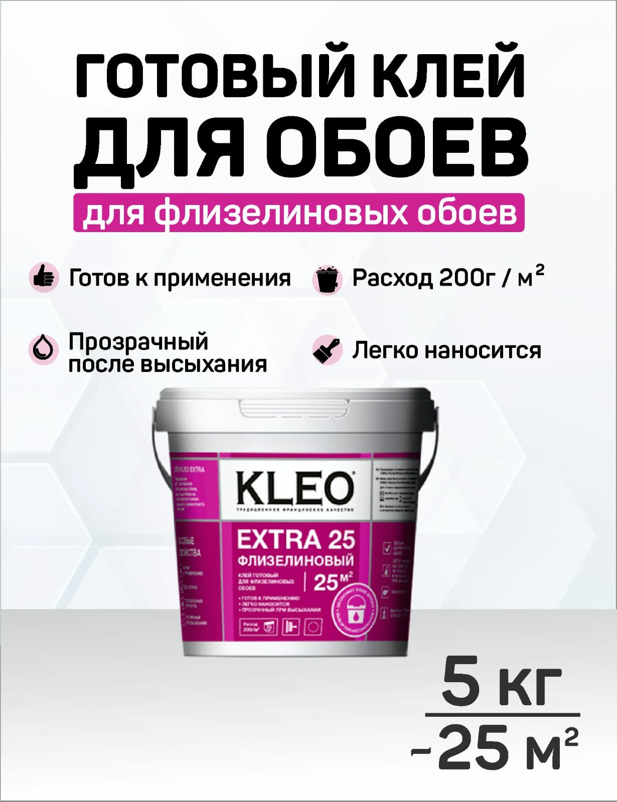 Клей готовый для флизелиновых обоев KLEO EXTRA на 25 кв.м для приклеивания всех видов флизелиновых обоев, виниловых обоев и фресок на флизелиновой основе, малярного (ремонтного) флизелина.