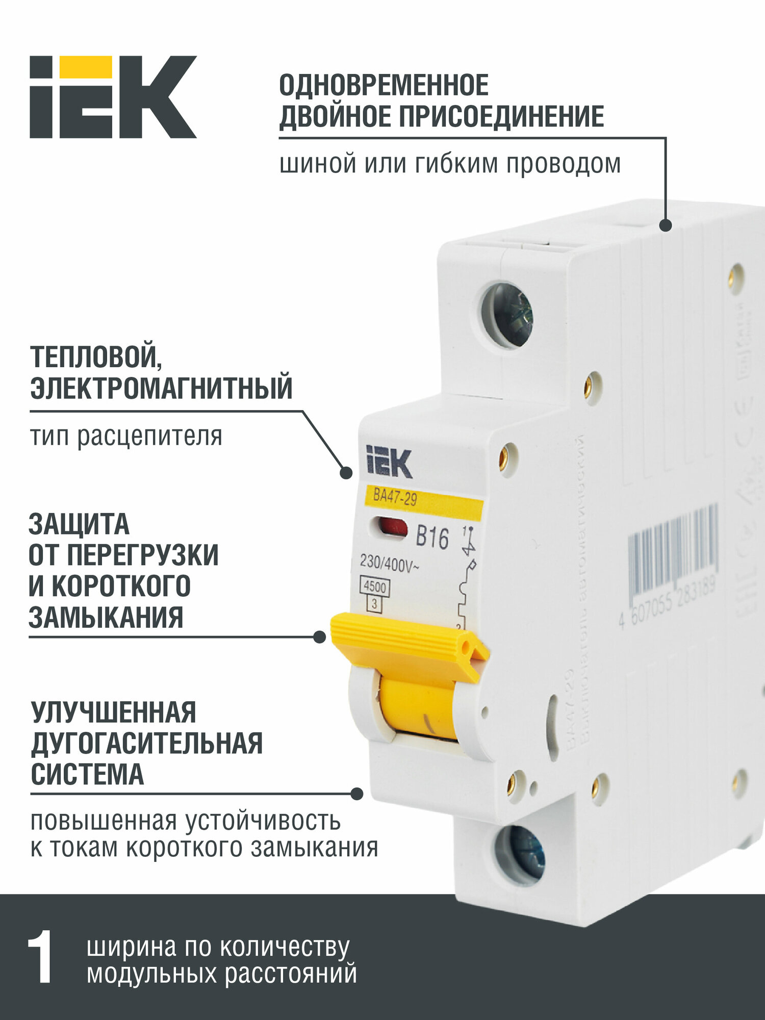 Выключатель автоматический модульный 1п B 16А 4.5кА ВА47-29 IEK MVA20-1-016-B (1 шт.)