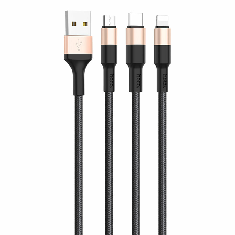 Кабель HOCO X26 Xpress 3 в 1, USB - Lightning, Micro USB, Type-C, 2.0A, длина 1.0м, черный с золотым