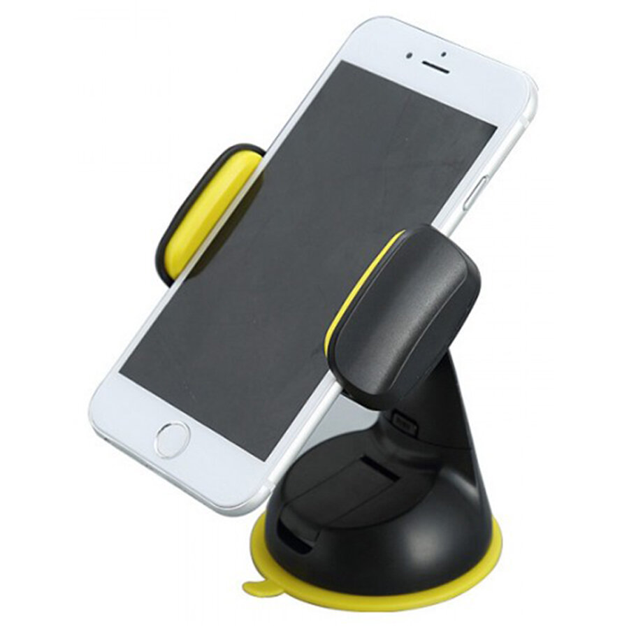 Держатель для телефона автомобильный зажимной с креплением на присоске. Подставка под смартфон на приборную панель и лобовое стекло в салон авто, черно-желтый