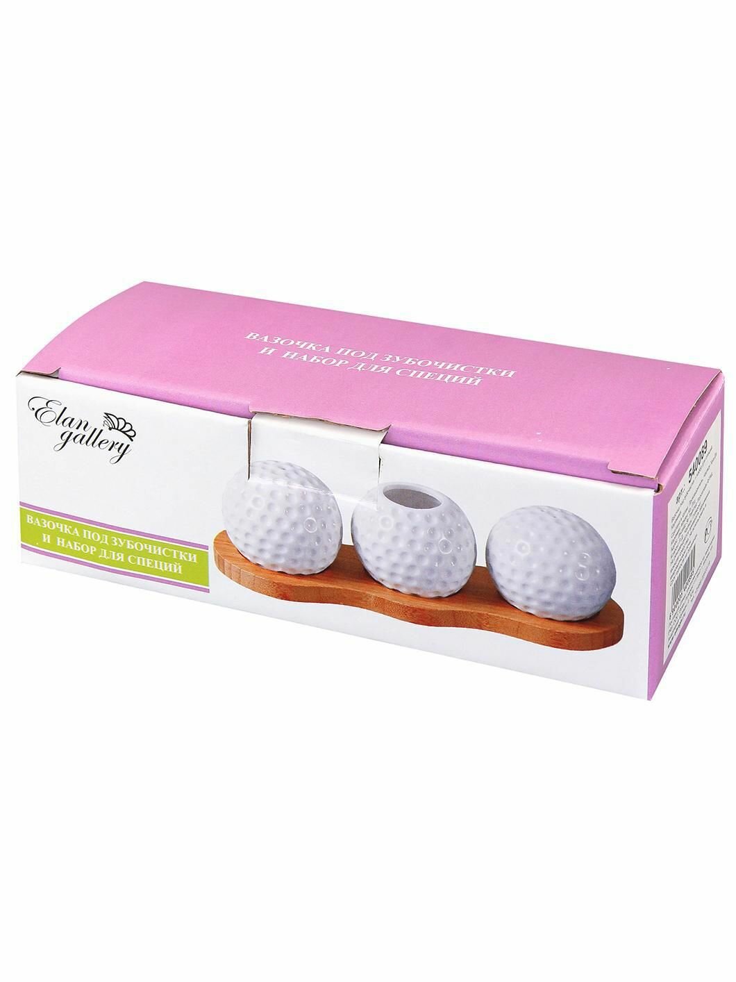Набор из вазочки под зубочистки, солонки, перечницы Elan Gallery "Сфера", на деревянной подставке интересное: