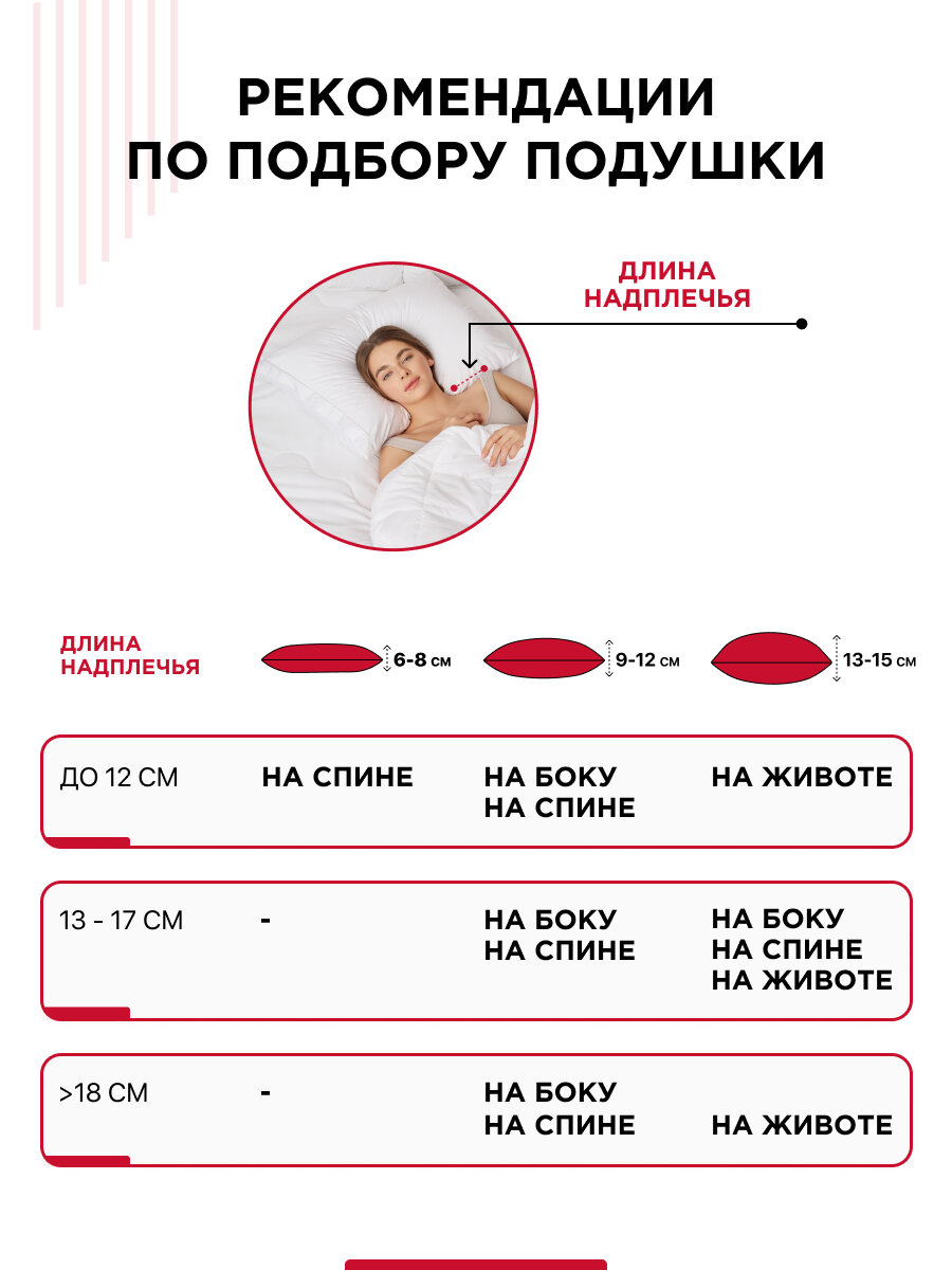 | Отзыв: | Мне подушка подошла, супер просто я в восторге! Хорошо поддерживает голову ни куда не проваливается. Высота плеча у меня 14см а подушки 16 см мне идеально подошло.