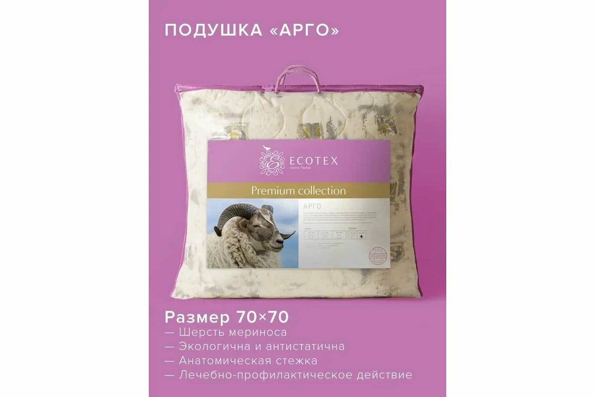 Подушка Ecotex Арго овечья шерсть, стеганый чехол, 100% хлопок ПАР57