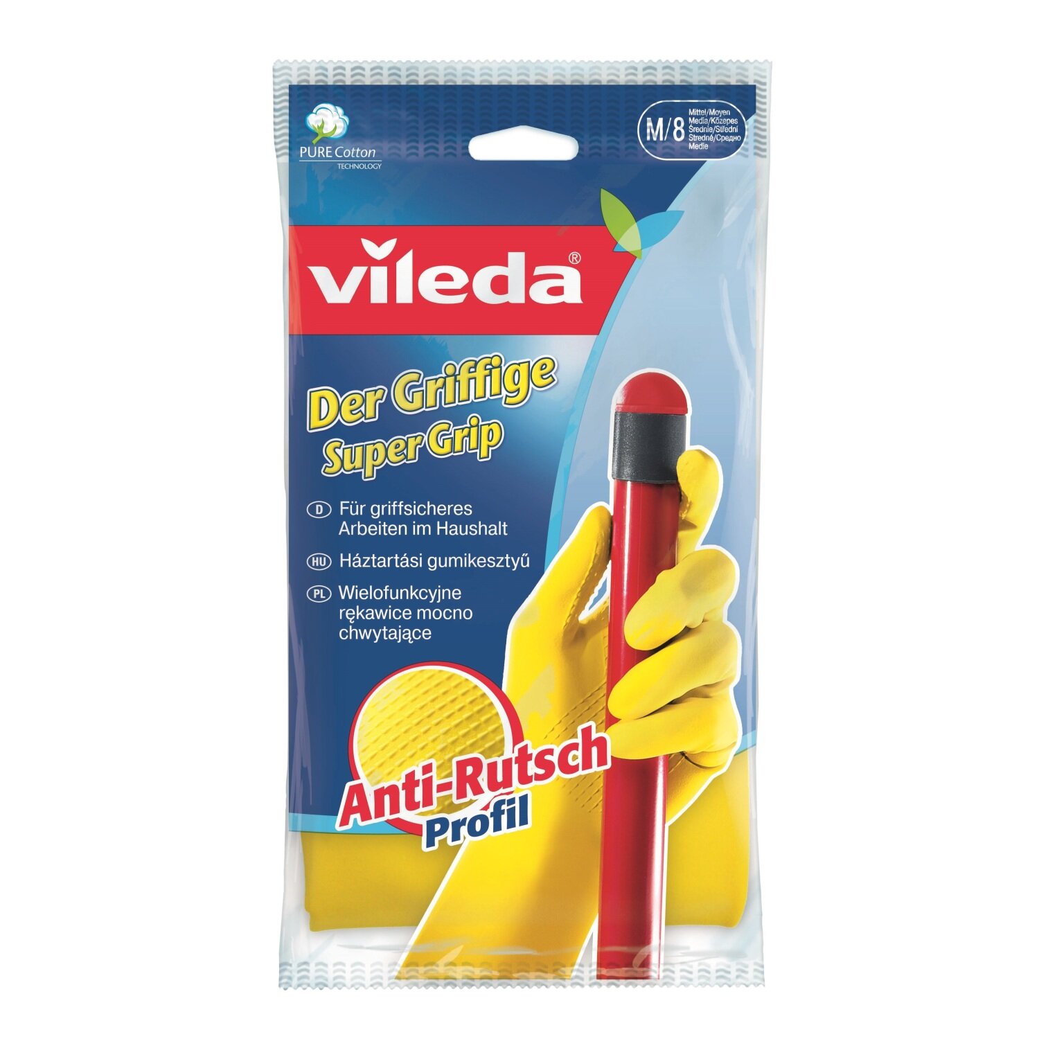 Купить Vileda Super Grip Резиновые перчатки хозяйсвтенные универсальные с рельефным профилел и внутренним хлопковым напылением Размер 8 M Средний
