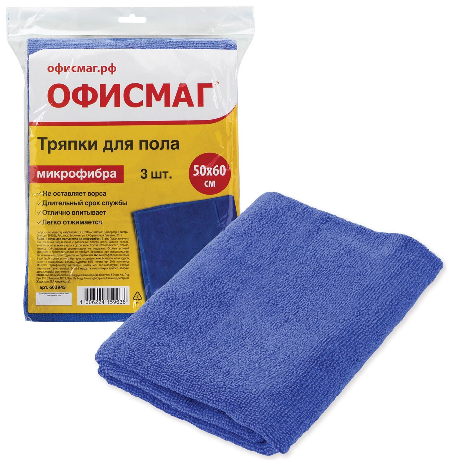 Тряпка для мытья пола Офисмаг, 50х60см, микрофибра синяя, 3шт. (603945)
